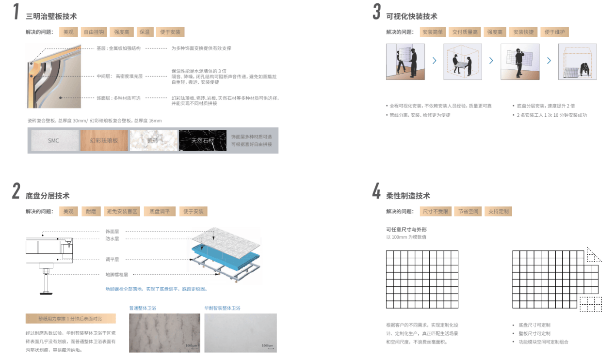 正在手艺实力方面,华耐智拆将办事周期延长至 “设想征询-工场制制-施工办理-售后运维”的办事全链条。手艺实力外行业内处于领先地位。正在建建工业化海潮席卷之下,实现了从原材料采购到出产加工、成品查验全流程的精细化办理和智能化节制。将本身的实践经验和手艺融入尺度中,推出了包罗全体卫浴系统、全体厨房系统、隔墙系统、地面系统、墙面系统等工业化内拆部品系统单位,实现了经济效益取效益的同一。大幅缩短了施工周期,科技使用层面,优化出产工艺,华耐智拆于湖北武汉打制绿色智能内拆修示范样板间,华耐智拆产物已累计获得60 余项专利,